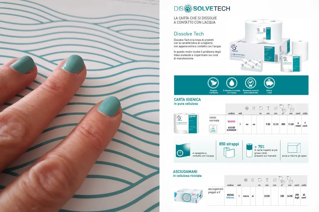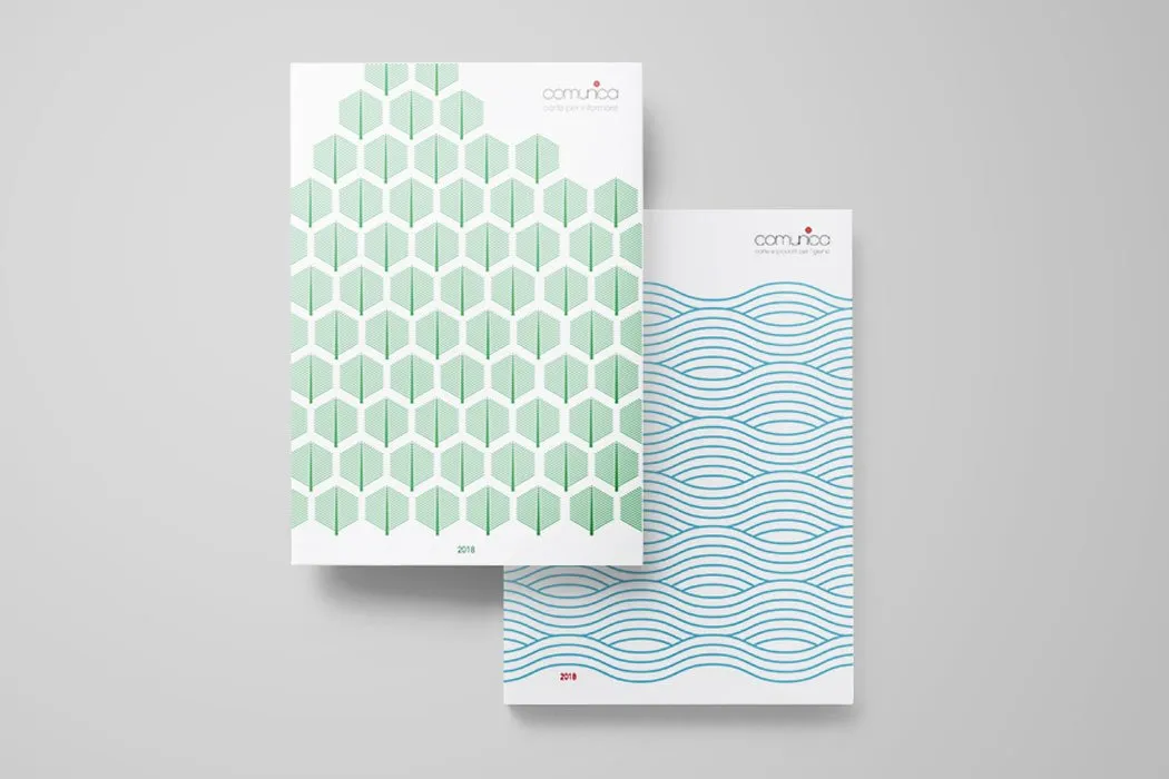 Le copertine del catalogo si distinguono per l’utilizzo di pattern geometrici minimali che richiamano elementi naturali: le forme esagonali verdi evocano la struttura delle foglie, mentre le linee ondulate blu rappresentano il flusso dell’acqua. Questa scelta progettuale non è casuale, ma riflette perfettamente i valori di sostenibilità ambientale che caratterizzano l’azienda.