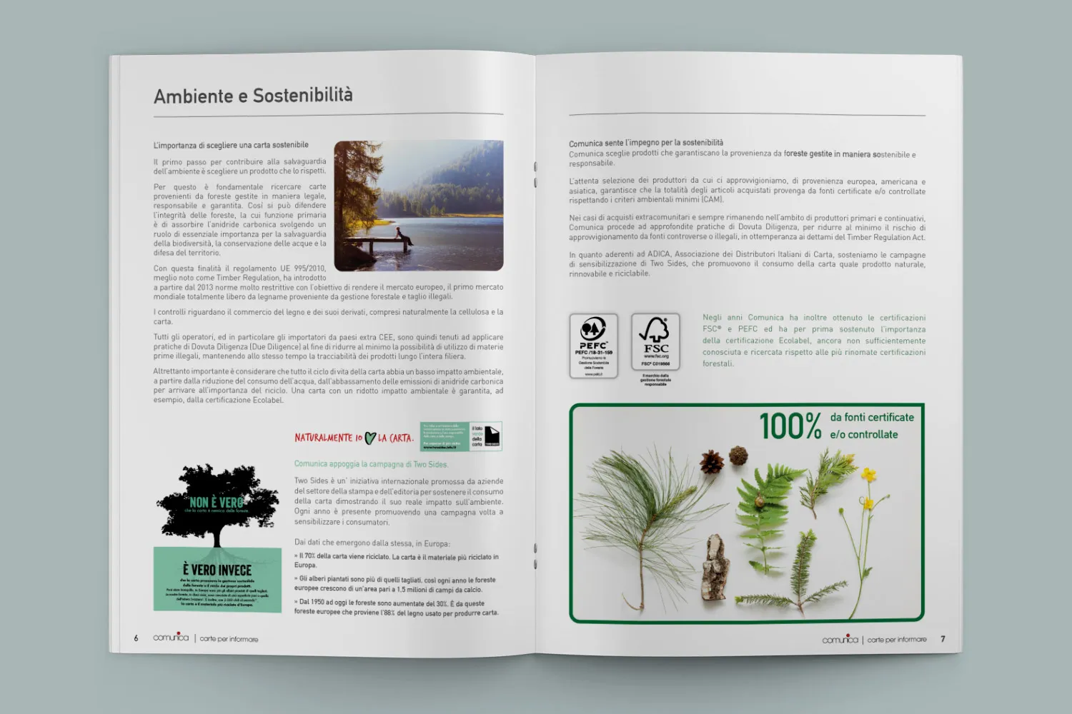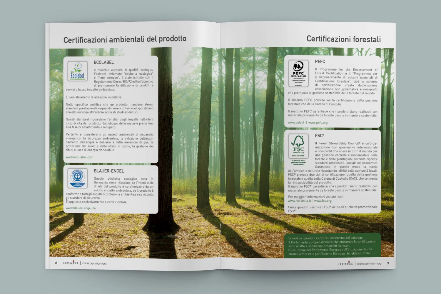 Il progetto integra fotografia ambientale e product photography. L’immagine della foresta utilizzata come sfondo per le certificazioni crea un potente storytelling visivo, mentre le foto di prodotto mantengono uno stile pulito e professionale che rispecchia gli standard qualitativi dell’azienda.