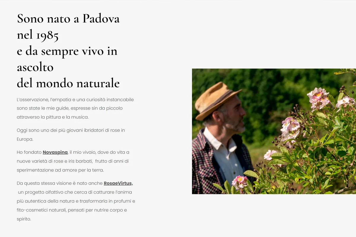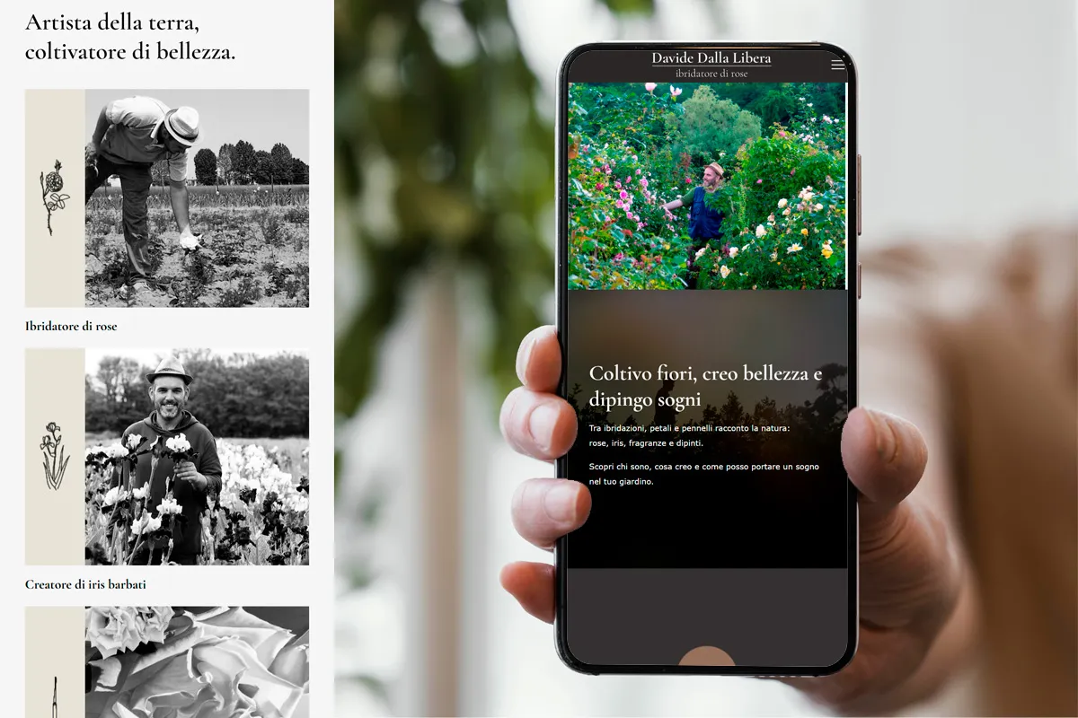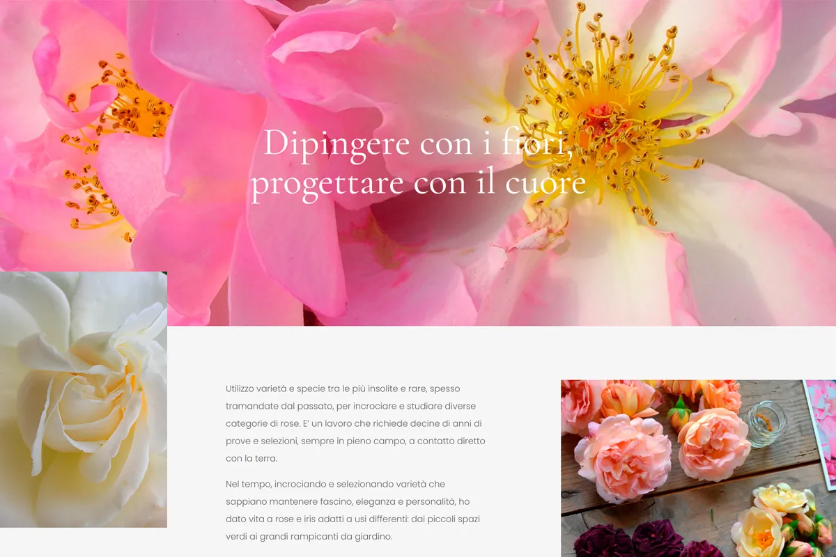 Ogni elemento grafico è pensato per valorizzare il mondo poetico e concreto dell’ibridatore di rose: dal layout fluido e arioso che guida il visitatore tra immagini e parole, alla tipografia che dialoga con eleganza con i petali e i paesaggi.